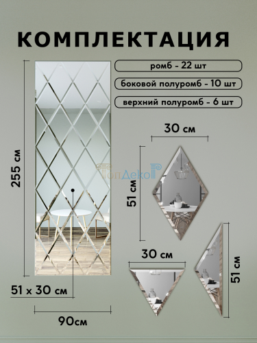 Зеркальное панно из зеркальной плитки ромб 30х51 см с фацетом 10 мм (размер 90х204см)